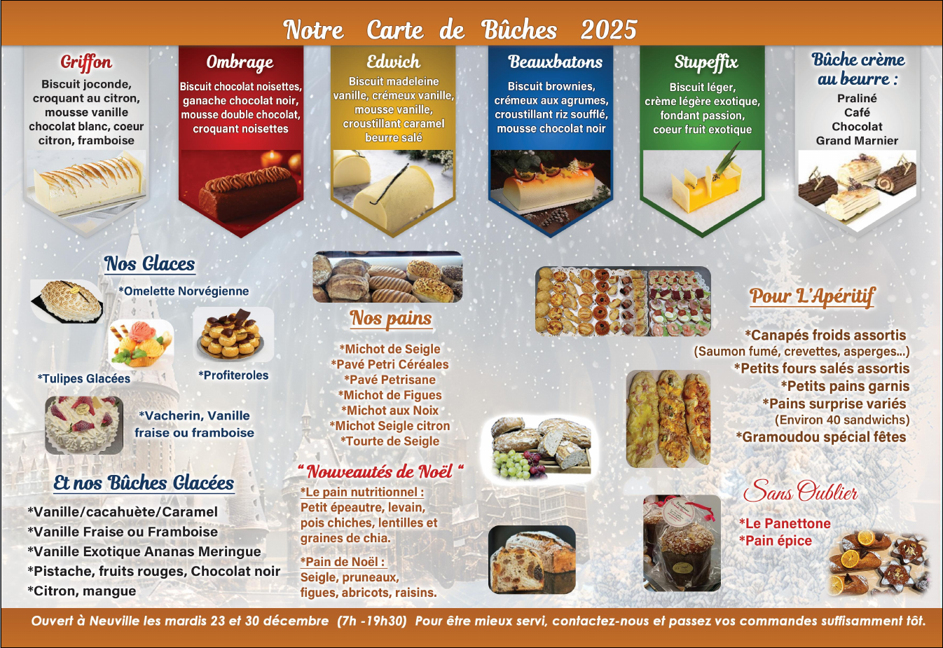 A noter que la Boulangerie sera exeptionnellement ouverte les mardis 23 et 30 décembre de 7h à 19h30