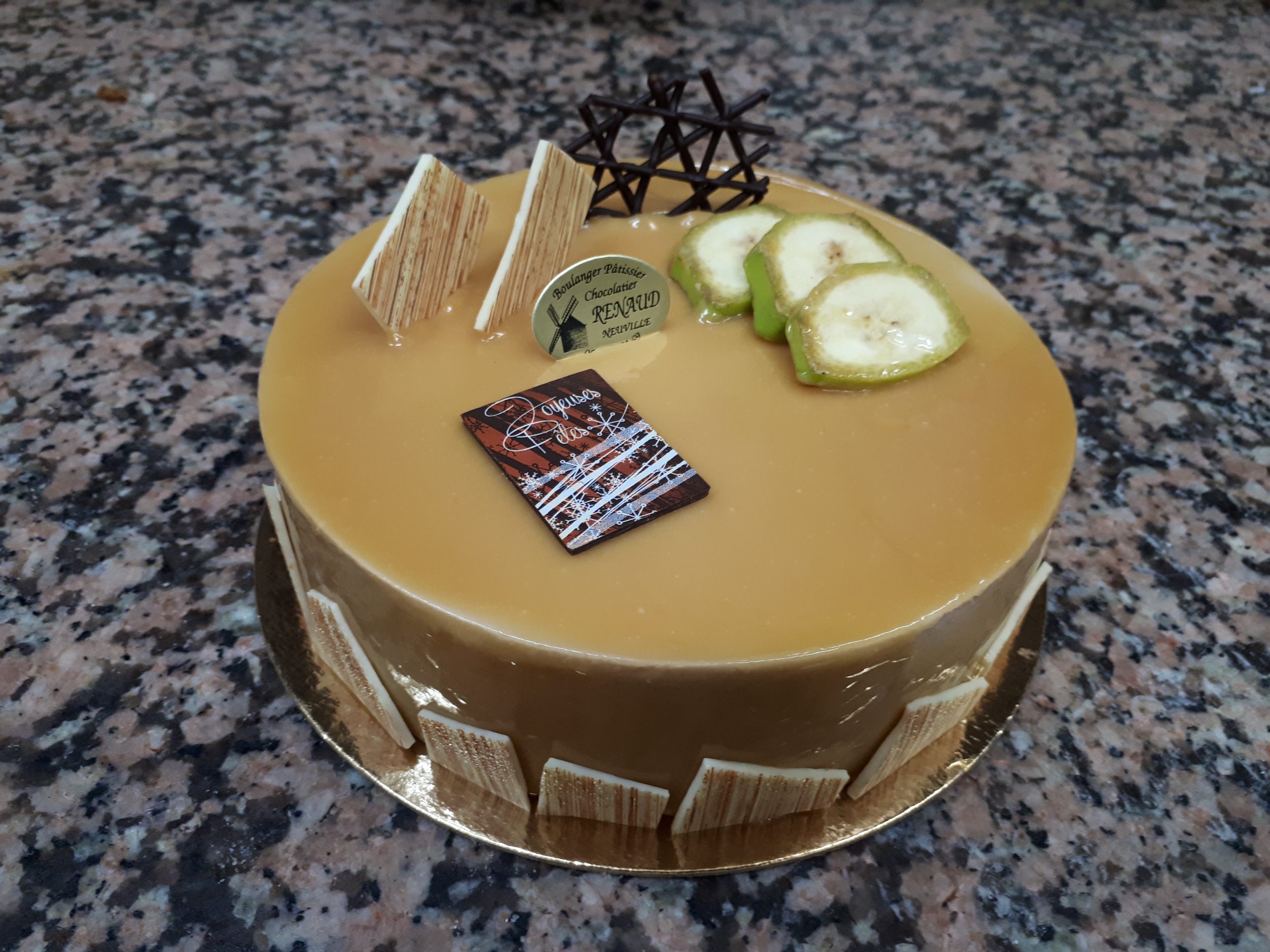 (Dacquoise noix de coco, feuilleté praliné, bananes poêlées au rhum, Caramel au rhum, fruits de la passion, chocolat lait)